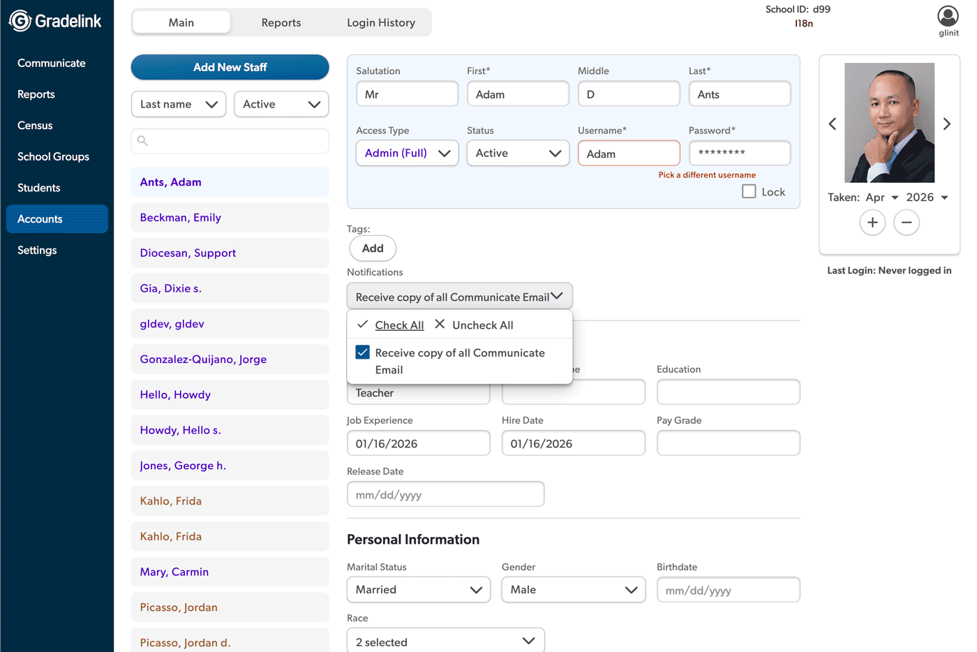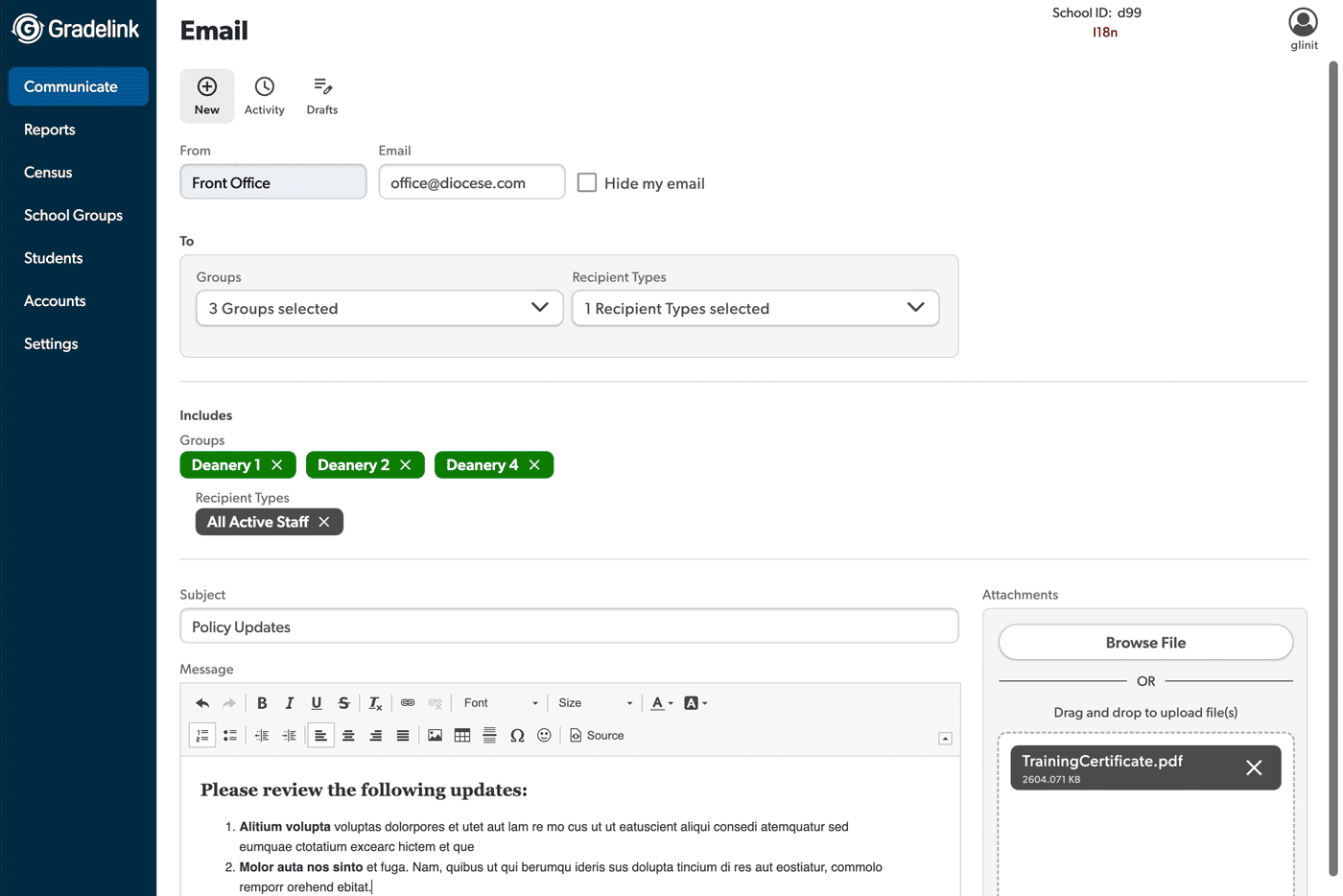 District and diocese admins can send emails to five different built-in groups directly through their district portal. Reaching groups like staff, parents, new enrollees, and more just got a whole lot easier.